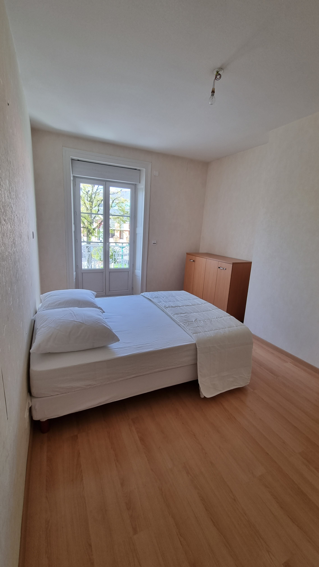 L'appartement se compose d'un séjour avec une cuisine ouverte aménagée et équipée, un dégagement desservant une salle d'eau, un wc et deux chambres dont une avec placard.