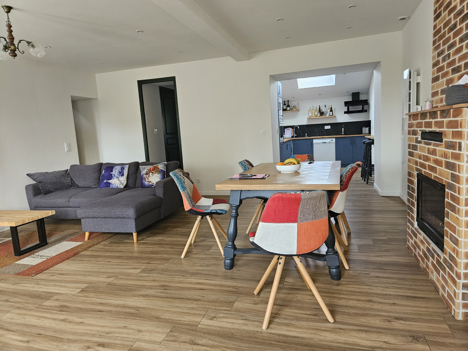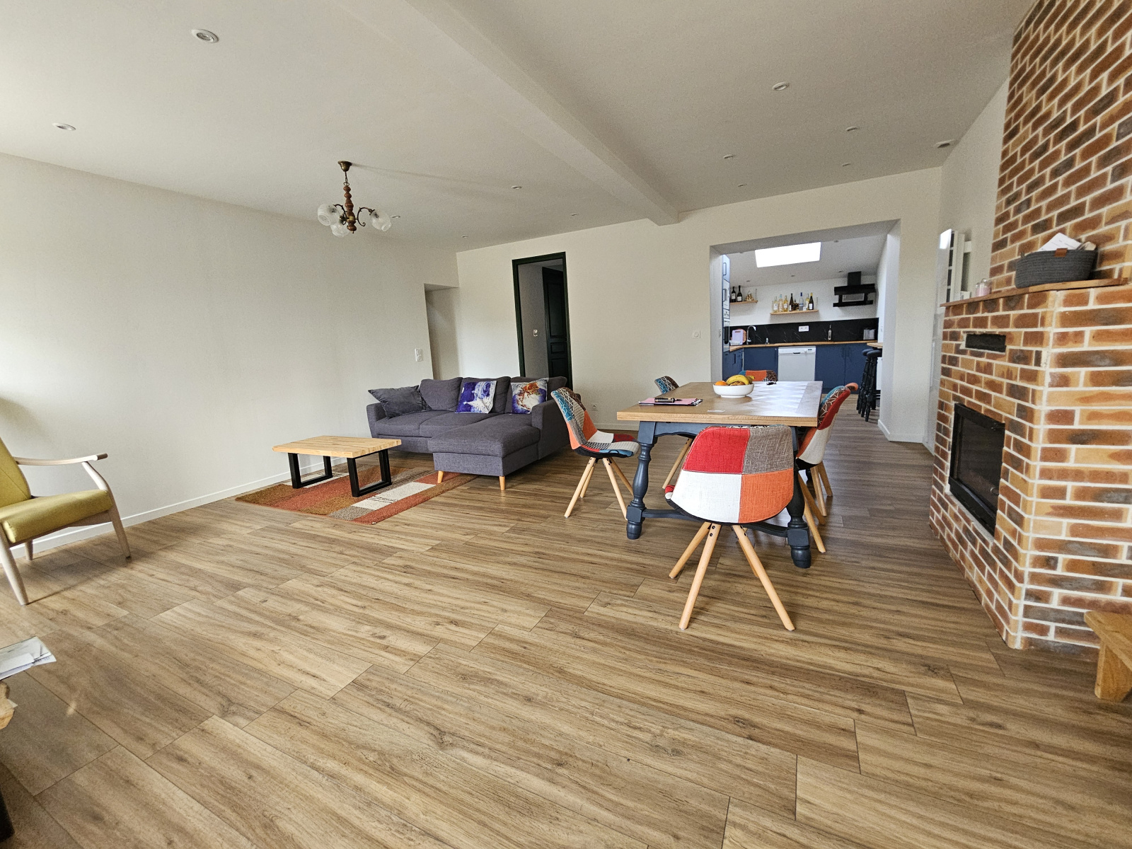 Maison charmante rénovée en 2020 de plus de 130m² habitable comprenant au rez de chaussée : une pièce de vie spacieuse et lumineuse avec cheminée insert, une cuisine moderne ouverte aménagée et équipée, un dégagement, salle d'eau à l'italienne et wc indépendant, couloir désservant buanderie, une première chambre, une seconde chambre parentale comprenant un espace pouvant servir de dressing, un wc, une salle de bains.
