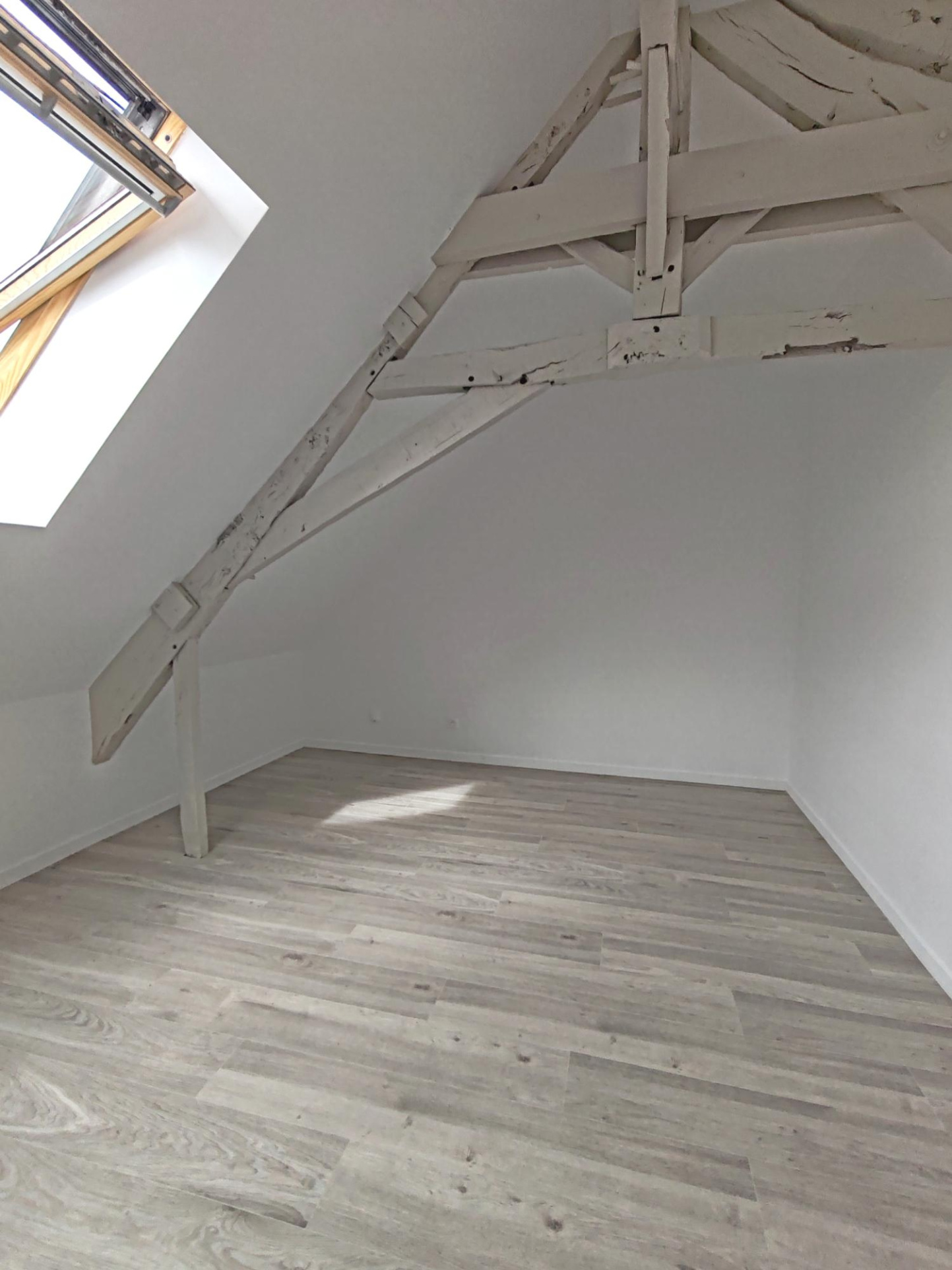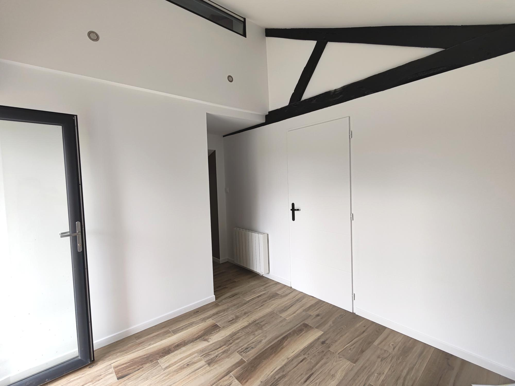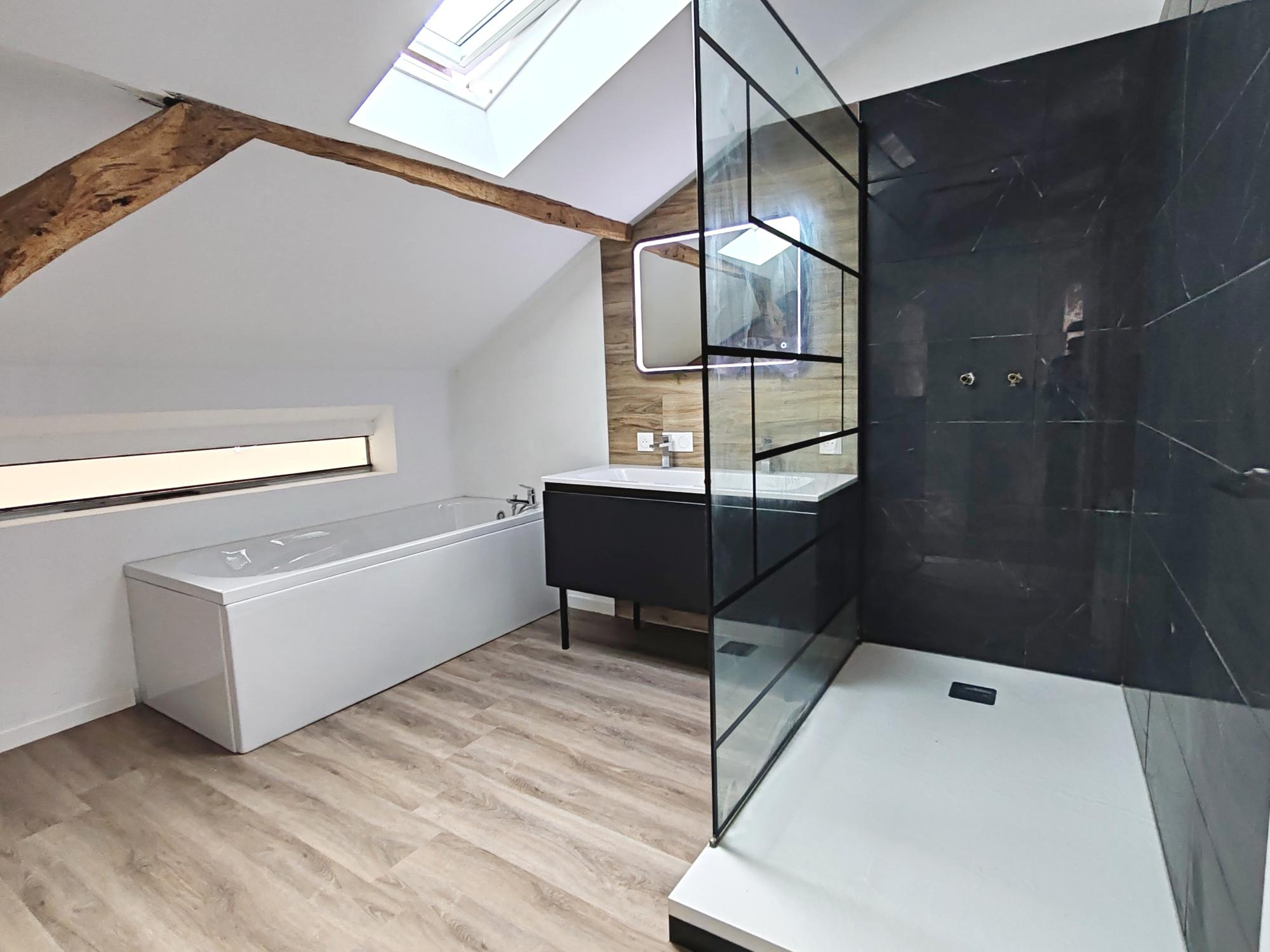 A l'étage, le palier dessert un second wc, une grande salle de bain avec baignoire et douche à l'italienne, ainsi que trois chambres lumineuses aux poutres apparentes.