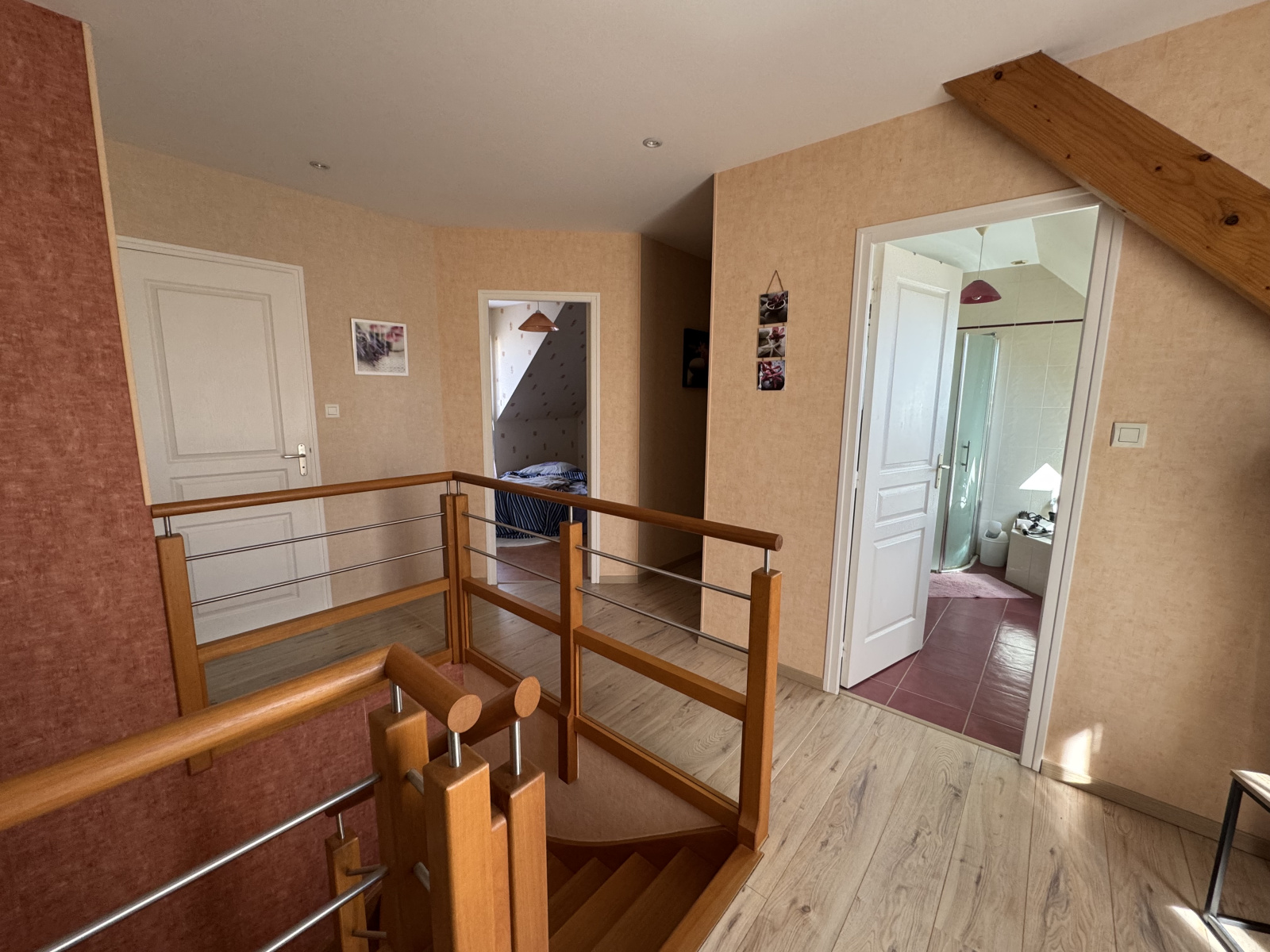 À l’étage, une mezzanine dessert quatre chambres avec placards, une salle de bains et une salle de jeux.