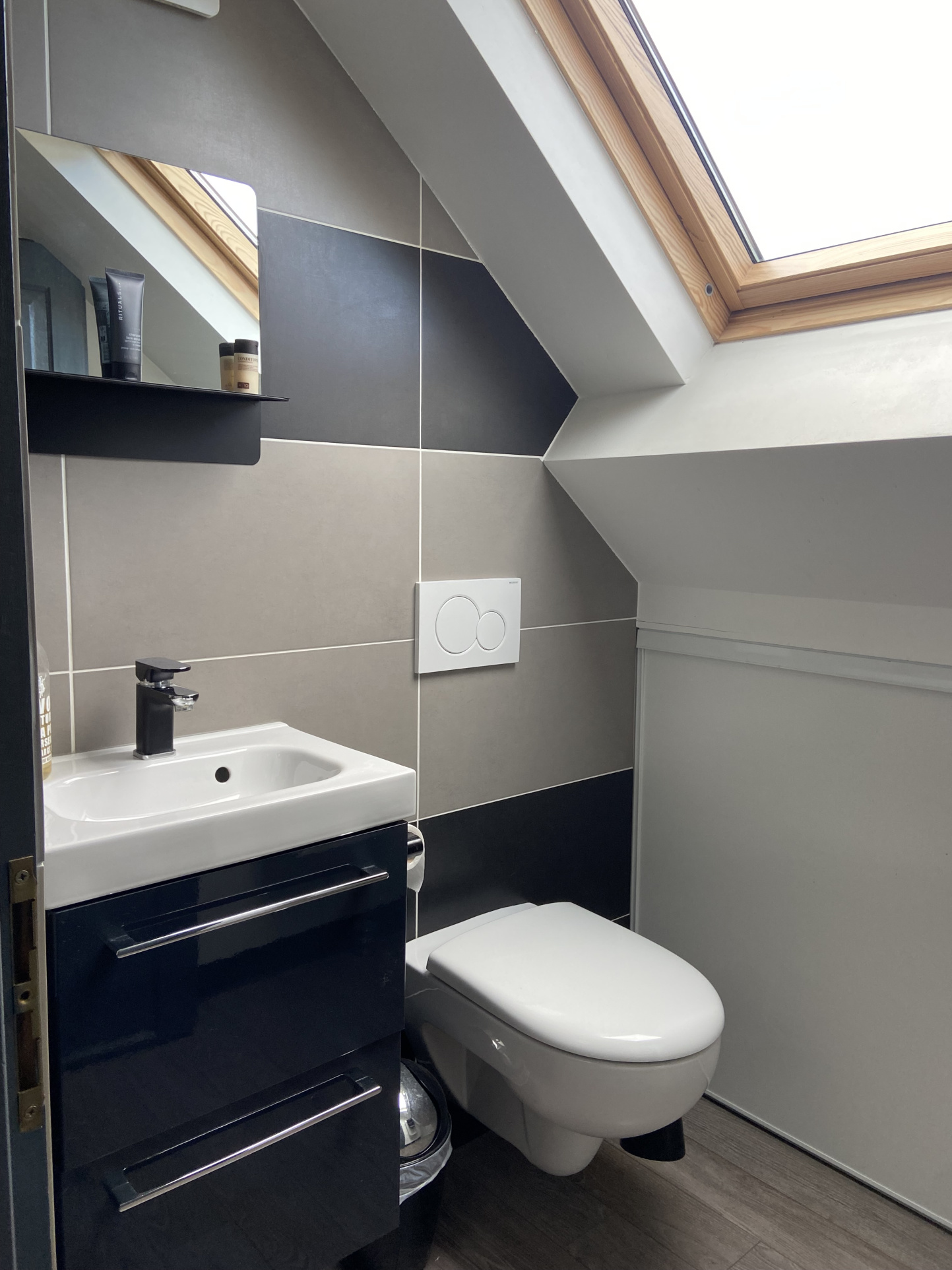 Au rez-de-chaussée, vous trouverez une vaste entrée avec poêle à bois desservant une arrière-cuisine, des toilettes, une cuisine ouverte aménagée et équipée, un séjour avec accès direct à la terrasse, un salon indépendant ainsi qu’une salle d’eau à terminer.