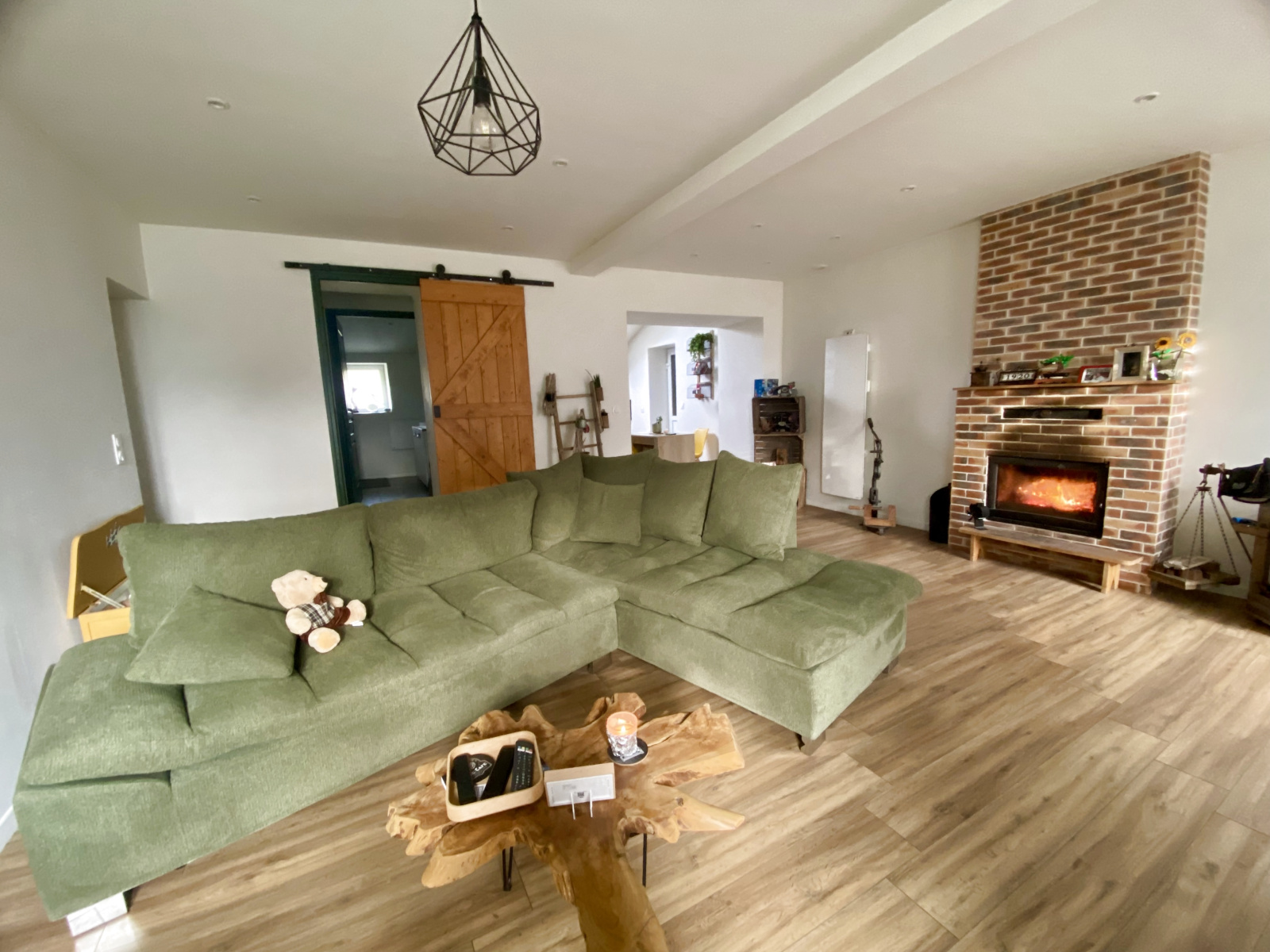 Cette maison vous offre, au rez-de-chaussée, une pièce de vie spacieuse et lumineuse exposée sud, avec cheminée insert, une cuisine moderne ouverte, aménagée et équipée, un dégagement, une salle d’eau à l’italienne et des WC indépendants.