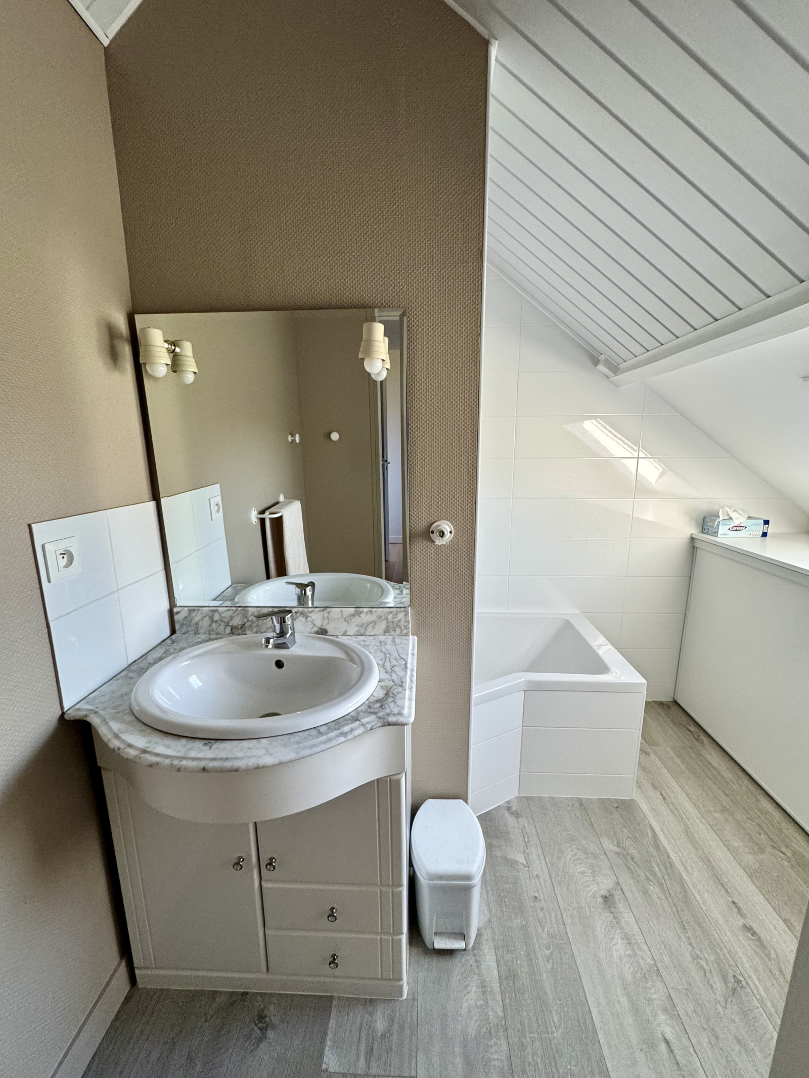 À l’étage, un palier distribue deux chambres supplémentaires, une salle de bains, un WC indépendant ainsi qu’un grenier offrant un espace de stockage appréciable.