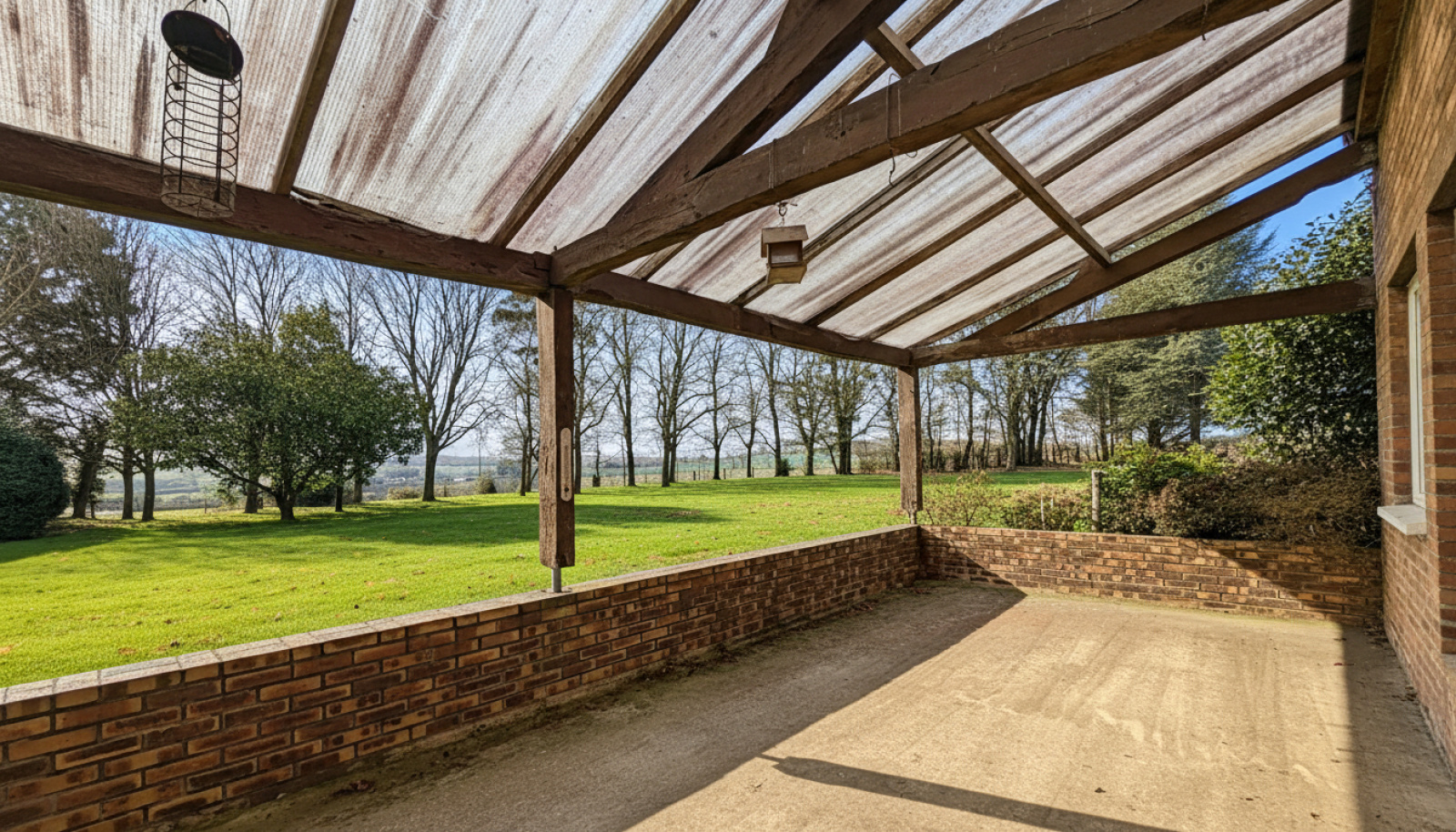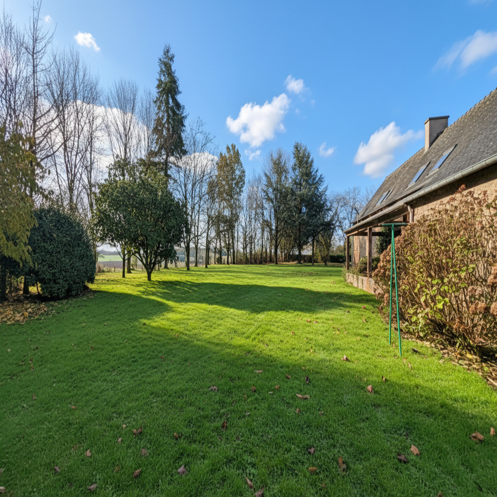 En extérieur, beau terrain arboré avec vue dégagée sur la campagne environnante comprenant une dépendance de 80m² et un portail motorisé.