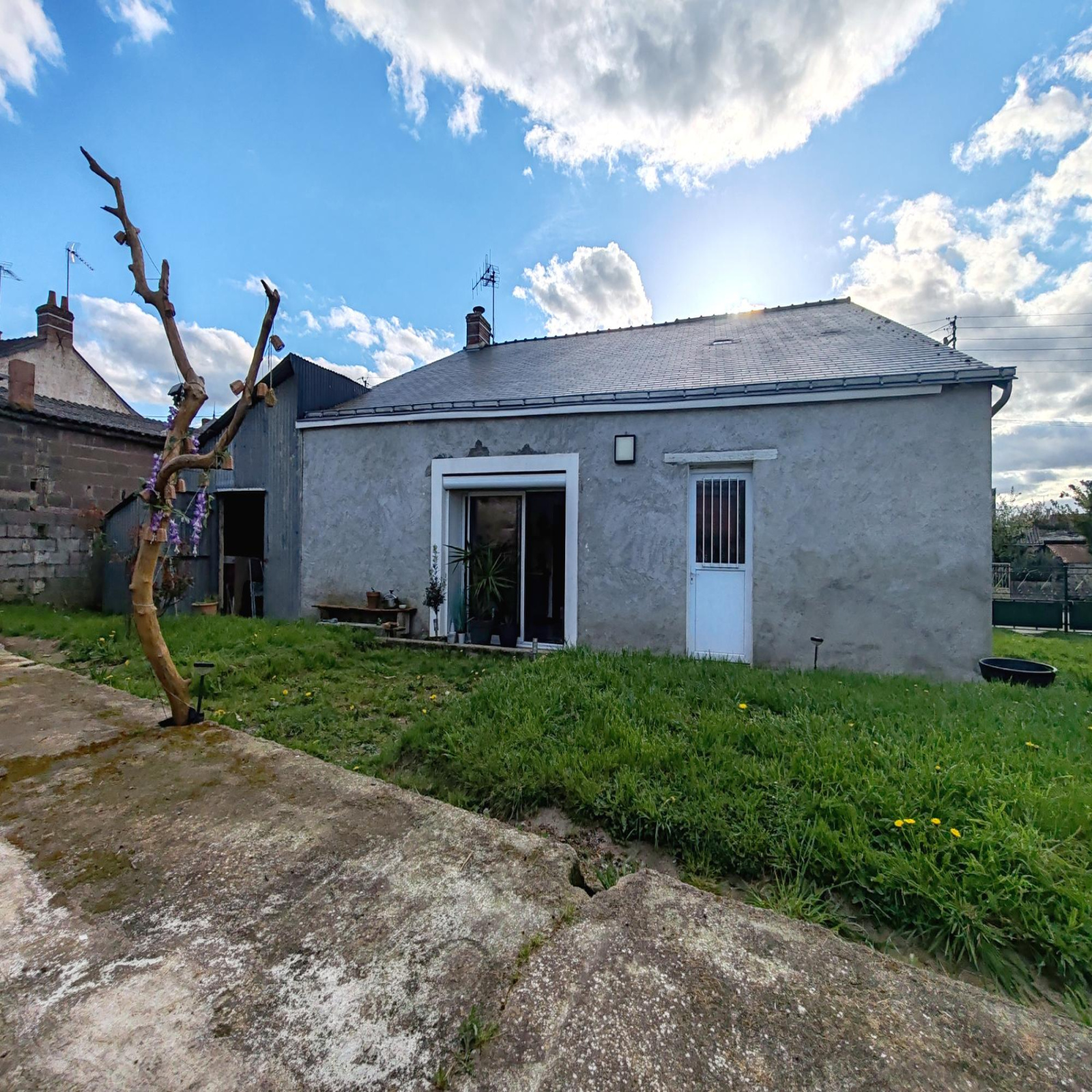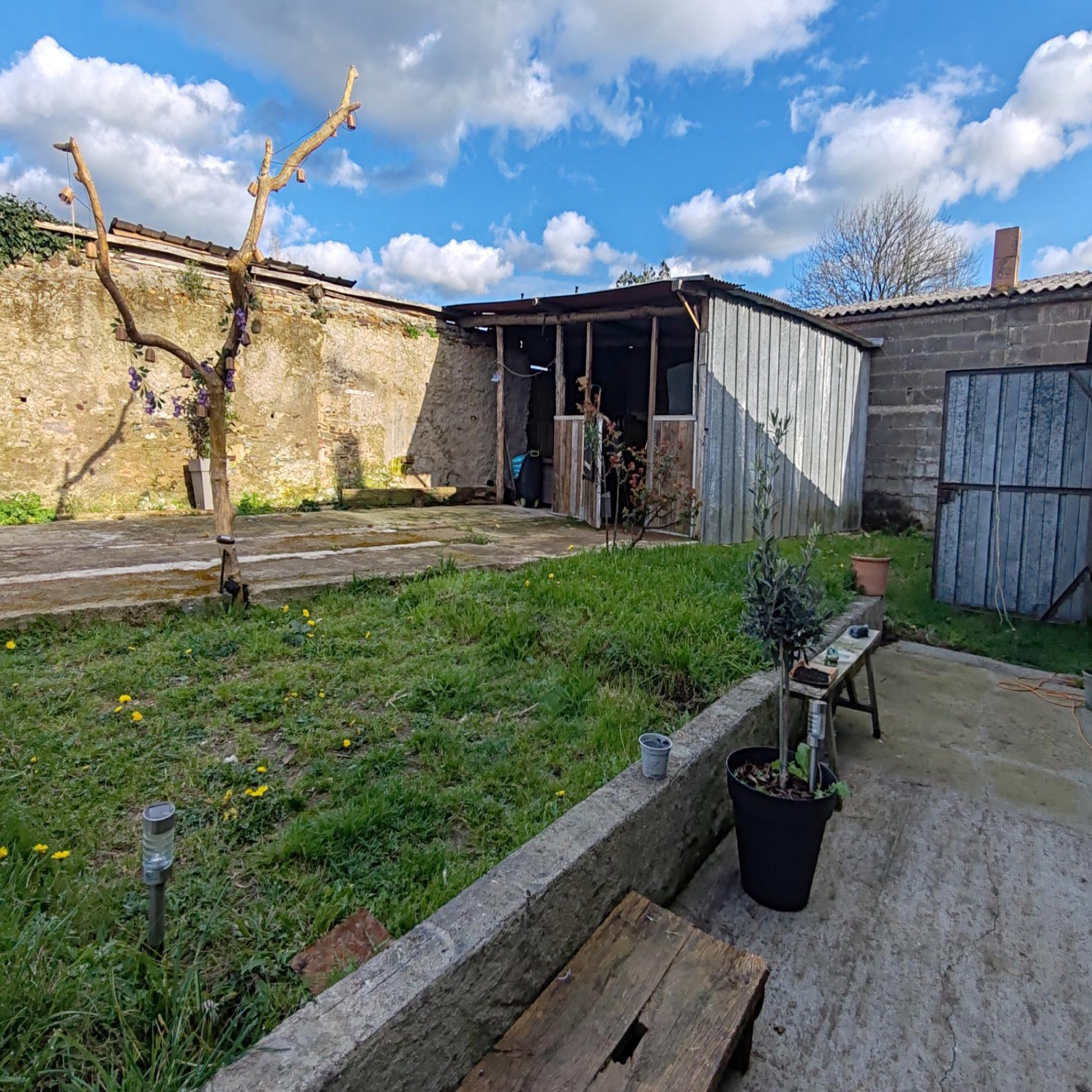 En extérieur, le terrain CLOS et sans AUCUN VIS A VIS se compose d'un abri pouvant être réagrandi comme à l'origine, d'un portail et d'une terrasse.