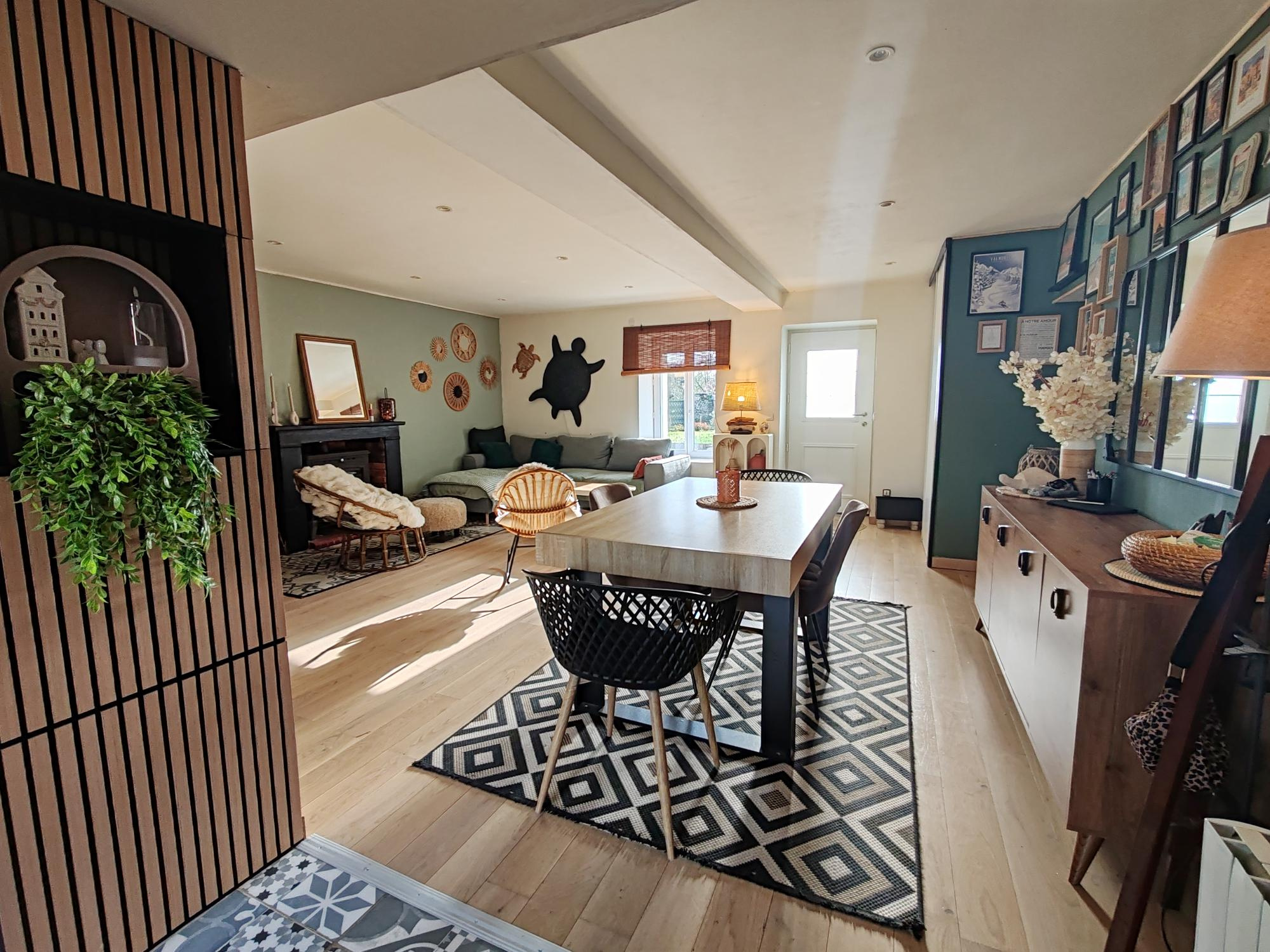 Elle comprend en rez-de-chaussée : une pièce de vie lumineuse et spacieuse avec rangement d'entrée ainsi qu'un poêle à bois. Attenante, la cuisine ouverte aménagée et équipée donne sur la terrasse à l'arrière de la maison.
